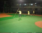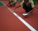 | 劃線:按標準尺寸量度定位,用帆布線標出線條位置,然后而用美紋紙沿帆布線貼在球場上,劃線漆均勻用毛刷刷于兩美紋紙之間,待涂料表面干后把美紋紙撕掉即可。 | ![]() |